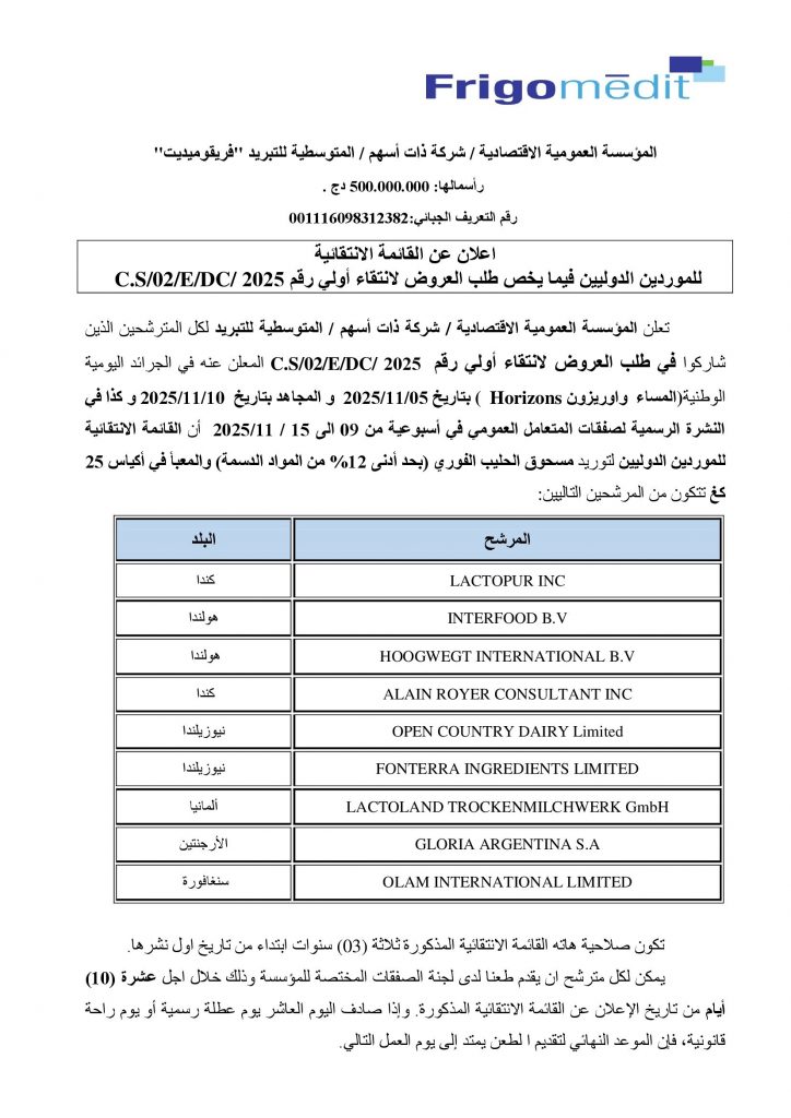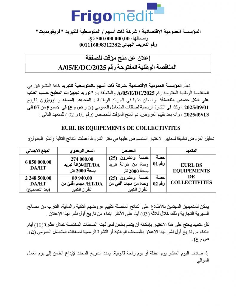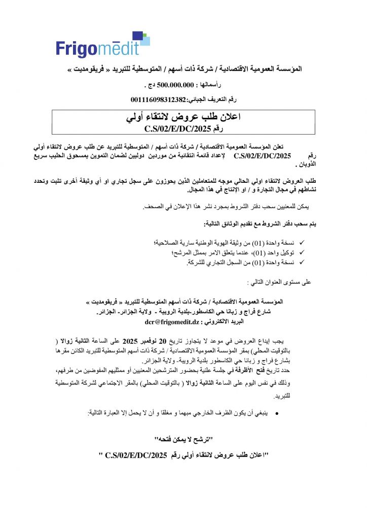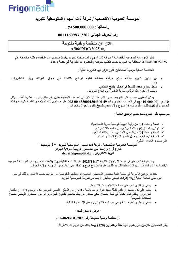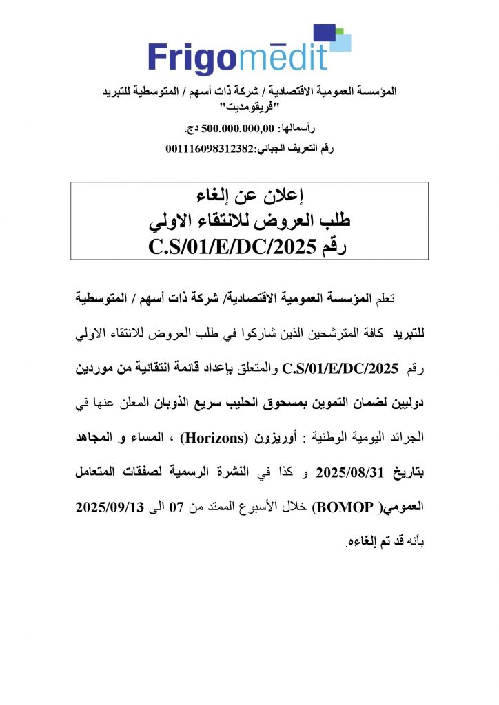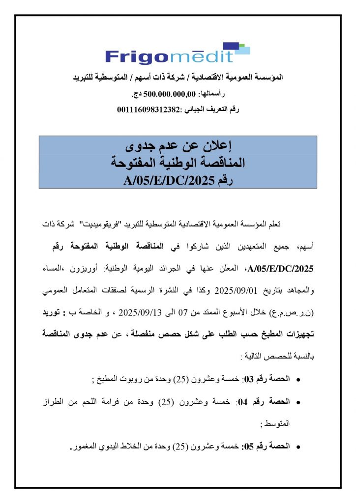 N°A/02/E/DC/2022 N°A/04/E/DC/2022 N°A/06/E/DC/2022 N°01/I/2022 N°C.S/02/E/DC/2023 N°C.S/01/E/DC/2023إعلان تمديد للآجال لطلب عروض لانتقاءأولي N°C.S/03/E/DC/2023إعلان تمديد للآجال N°C.S/06/E/DC/2023 إعلان عن عدم جدوى N°C.S/08/E/DC/2023 إعلان عن إلغاء N°C.S/07/E/DC/2023 إعلان عن عدم جدوى N°C.S/06/E/DC/2023 N°04/I/2023 N°A/01/E/DC/2024 N°A/01/E/DC/2024 اعلان عن عدم جدوى N°C.S/02/E/DC/2023إعلان عن تحديث 01 N°02/I/2024 N° A/04/E/DC/2024 إشعار بتمديد المهل N°A/05/E/DC/2024 N°A/07/E/DC/2024 N°A/07/E/DC/2024 إعلان عن تمديد أجال N°A/01/E/DC/2025 N°04/I/2025 N°A/04/E/DC/2025 N°C.S/01/E/DC/2025 N°A/06/E/DC/2025 علان عن عدم جدوى المناقصة N°A/05/E/DC/2025 N°A/07/E/DC/2025 N° C.S/02/E/DC/2025 N°A/03/E/DC/2022 N°A/05/E/DC/2022 N°A/07/E/DC/2022 N°A/09/E/DC/2022 N°01/I/2023 N°C.S/01/E/DC/2023 N°C.S/05/E/DC/2023 N° A/01/E/DC/2023 إعلان عن عدم جدوى N°C.S/05/E/DC/2023 N°A/03/E/DC/2023 إعلان عن عدم جدوىN°C.S/04/DC/2023 إعلان عن عدم جدوىN°A/03/E/DC/2023 N°01/I/2024 N° A/02/E/DC/2024 N° CS/02/E/DC/2023 تحديث رقم 01 No A/03/E/DC/2024 N° A/05/E/DC/2024 N°03/I/2024 N°A/06/E/DC/2024 N°A/02/E/DC/2025 N°A/03/E/DC/2025 N°03/I/2025 N°A/04/E/DC/2025 إعالن عن تمديد أجال N°A/05/E/DC/2025 إعلان عن إلغاء C.S/01/E/DC/2025 N°C.S/02/E/DC/2025 N°A/05/E/DC/2025إعلان عن منح مؤقت للصفقة